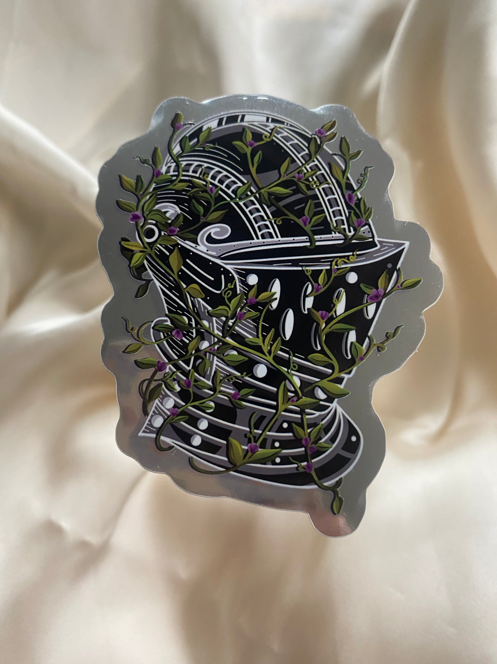 Meet the Overgrown Helmet Sticker—a glossy design with a shimmering mirrored background that catches the light beautifully. Featuring a helmet wrapped in twisting vines, this playful sticker adds a fresh and adventurous vibe to your laptop, water bottle, or notebook. It’s perfect for those who love a mix of boldness and nature-inspired charm.